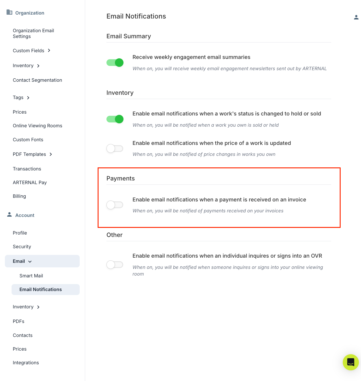 You'll now receive an email notification when an invoice is marked as paid. To enable it, go to Account โ Email โ Email Notifications and toggle on the notification under Payments.